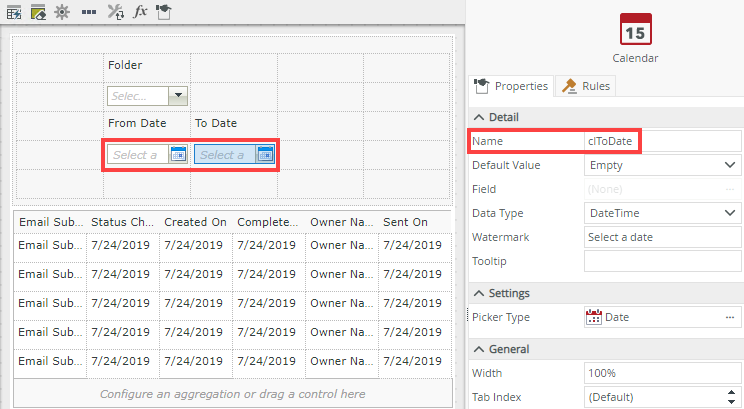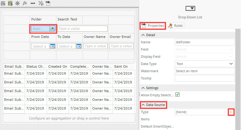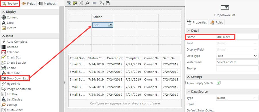 - Drag a Drop-Down List control onto the canvas. The control is available in the Input section of the Toolbox. Change the Drop-Down List control name to ddlFolder (in the Name field).
