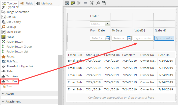 - Drag a Label and a Text Box control onto the canvas.