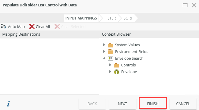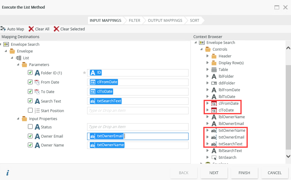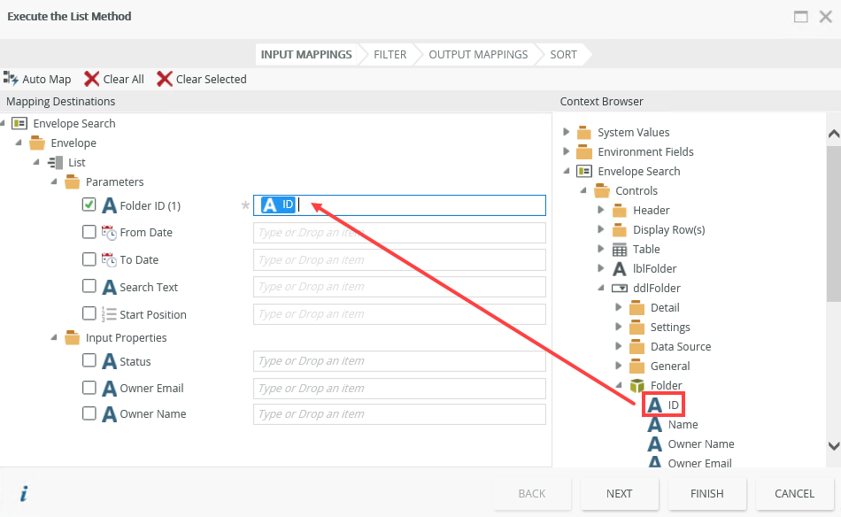 - On the Execute the List Method page, expand the Envelope Search in the context browser and drag the Controls > ddlFolder > Folder > ID property into the Folder ID parameter. Click Finish.