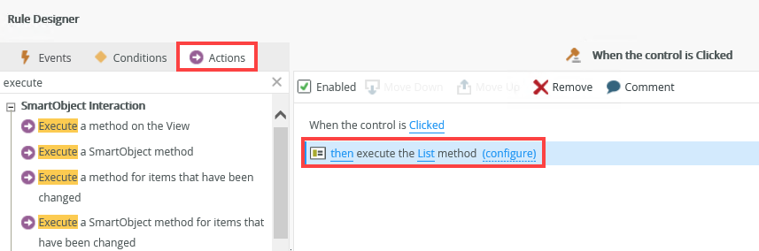 - Select the Actions tab. Select the Execute a method on the View. Click the select method link and select List. Next you click the configure link.