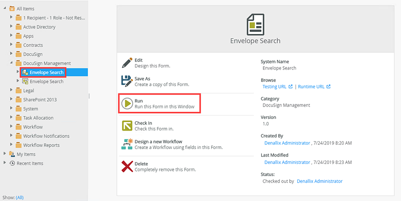 Finally, you generate a form and run it and perform a search on the DocuSign folders.