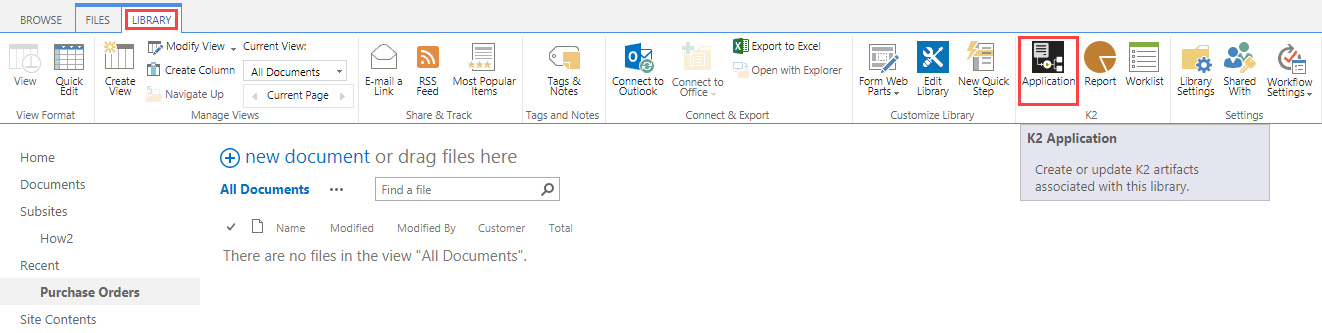 3. On the Library tab, click the Application button to integrate the library with K2 for SharePoint. You may need to switch to Classic SharePoint mode. For more information see SharePoint Online User Interface Changes.