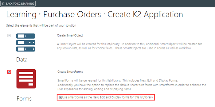 4. On the Create K2 Application page, select the Create SmartForms check box as shown below.