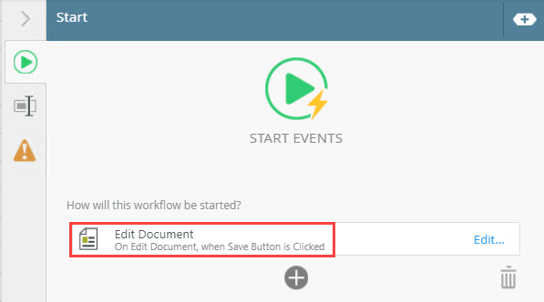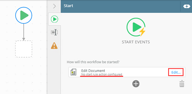 1. Select the Start step. Notice that the Edit Document form is automatically added to the Start step but the start rule action is not configured. To edit the start rule action, click Edit.