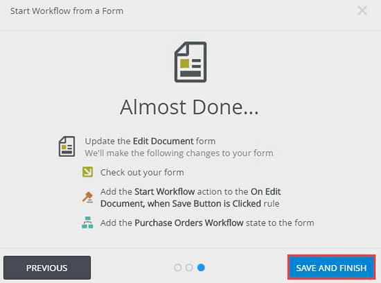4. The Almost Done page shows. This page contains all changes to the form. Click Save and Finish.