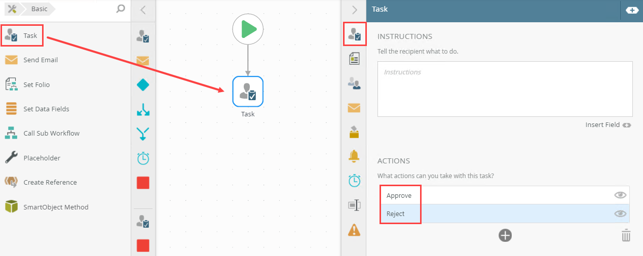 10. From the Toolbox, click the Basic category and drag the Task step onto the canvas. Select the Task tab and create two task actions (Approve and Reject).