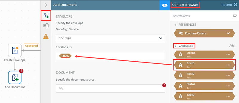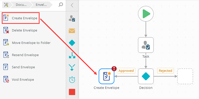 1. From the Toolbox click the DocuSign category, the Envelope category and then drag the Create Envelope step onto the canvas. Connect the step to the Approved task action.