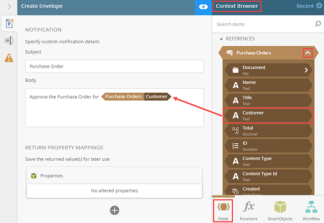 3. Configure the Notification. In the Subject field, type Purchase Order. In the Body field, type Approve the Purchase Order for and then drag the Customer property from the Purchase Orders reference into the notification body. This adds the customer name to the notification. You can find the reference in the Context Browser, References section and then expand the Purchase Orders reference.