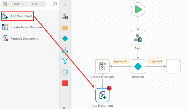 1. From the Toolbox, click the DocuSign category, the Document category, and then drag the Add Document step onto the canvas. Connect the step to the Create Envelope step.