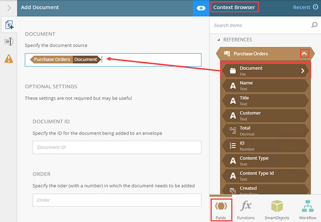 3. Configure the Document section. From the Purchase Orders reference, drag the Document property into the Document field.