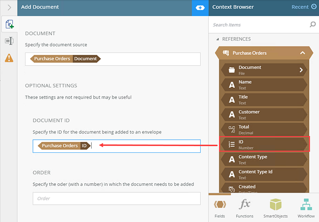 4. Configure the Document ID. From the Purchase Orders reference, drag the ID property into the Document ID field.