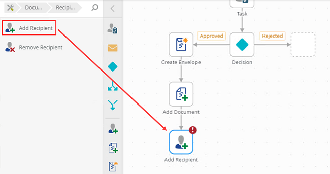 1. From the Toolbox, click the DocuSign category, the Recipient category and then drag the Add Recipient step onto the canvas. Connect the step to the Add Document step.