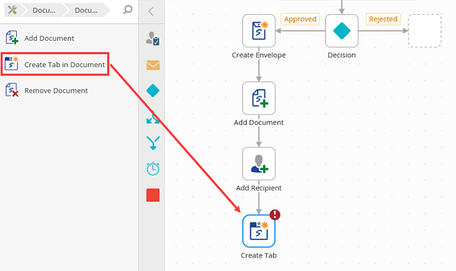 1. From the Toolbox, click the DocuSign category, the Document category and then drag the Create Tab in Document step onto the canvas. Connect the step to the Add Recipient step.
