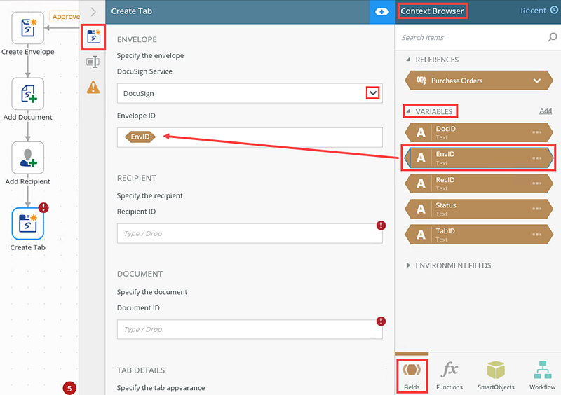 2. Select the step and click the expand / collapse toggle to expand the Configuration Panel. You can also double click the step to expand the panel. Select the Create Tab tab to configure the DocuSign service instance, envelope ID, recipient ID, tab details, tab positioning, and the return property mappings. From the DocuSign Service menu, select the service instance. From the Variables section, drag the EnvID property into the Envelope ID field.