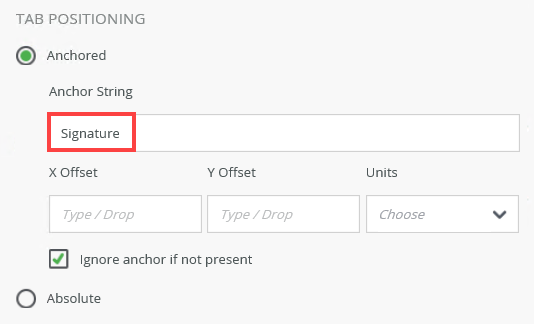 6. Configure the Tab Positioning section. In the Anchor String field type Signature. The purpose of this field is to specify where the DocuSign tab is added to the document. In this example, the tab is added close to the Signature text in the document.