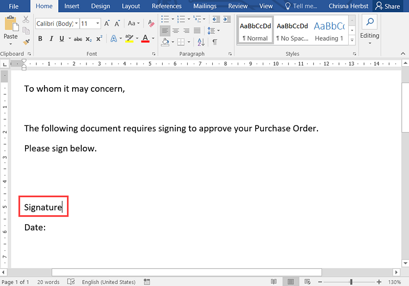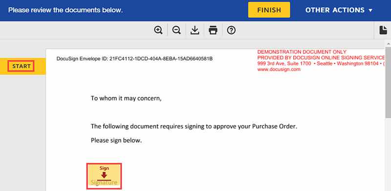 8. Click the Start link and then the Sign tab to sign the document with an electronic signature.