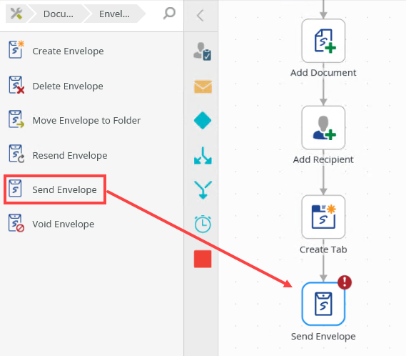 1. From the Toolbox, click the DocuSign category, the Envelope category and then drag the Send Envelope step onto the canvas. Connect the step to the Create Tab step.