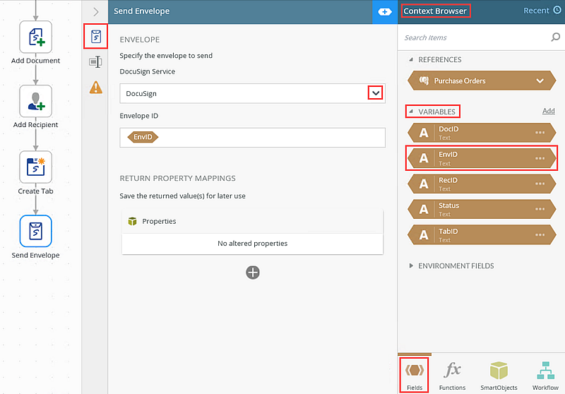 7. Add the Send Envelope step to the workflow. In this step, you add and configure the Send Envelope step to send the item to the recipient for signature.