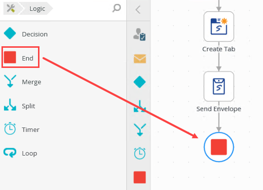 1. From the Toolbox, click the Logic category, and drag the End step onto the canvas. Connect the step to the Send Envelope step.