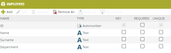 - In the Designer create a SmartBox SmartObject named Employees with Name, Surname, and Department properties.