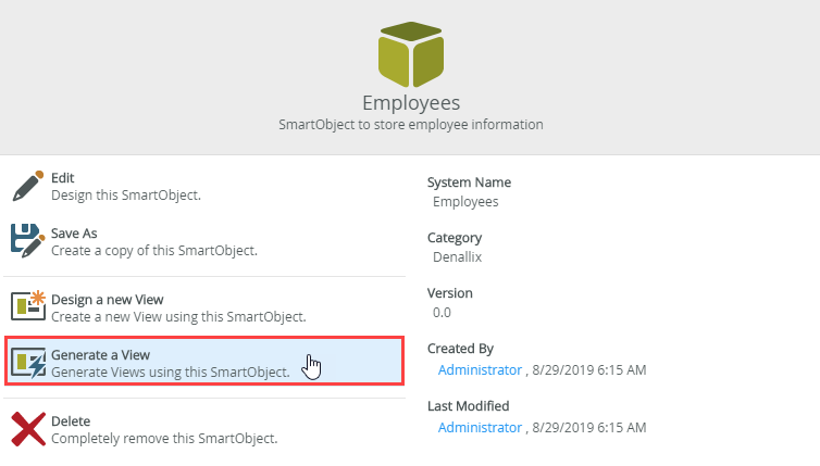 - On the Employees SmartObject page click Generate a View.