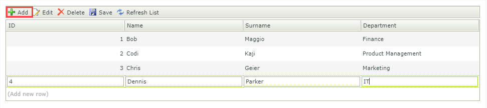- Click Add and specify a Name, Surname, and Department. Use the image below as a guide to adding sample data.
