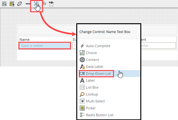 - Click the Change Control icon and select Drop-Down List. Click OK.