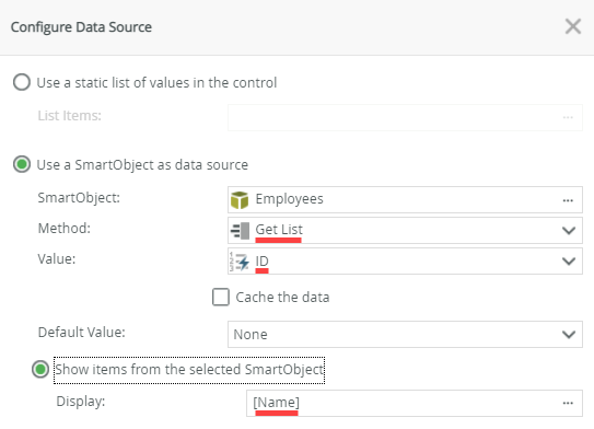 - Confirm that the SmartObject data source is configured to the Get List method with the ID value, and that the Name field is selected for the Display value. Click OK.