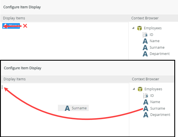 - Delete the Name property by clicking just right of the variable and backspace (using your keyboard's <BACKSPACE> button). Then drag and drop the Surname property from the Employees SmartObject. You want to show the surname in this field. Click OK and OK again to save the configuration.