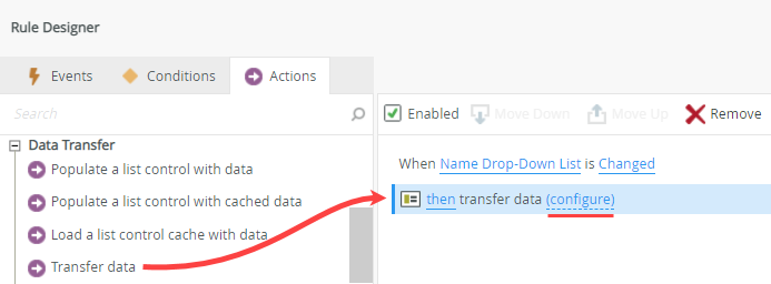 - With the Actions tab selected, navigate to and click Transfer data. Click configure.