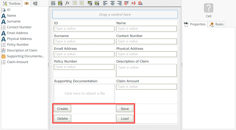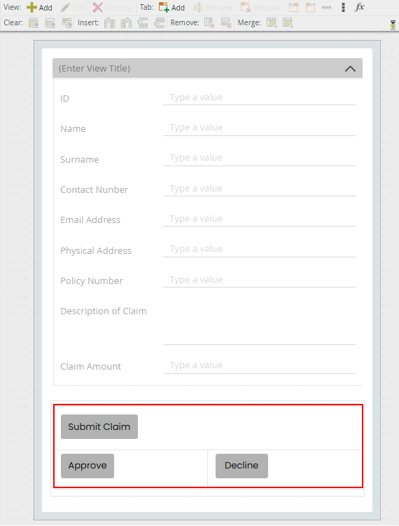 - Add three buttons to the form called Submit Claim, Approve, and Decline