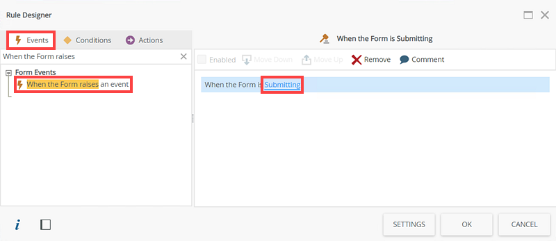- Select the When the Form is Submitting option from the Form Rules section. The Actions section should display the following: