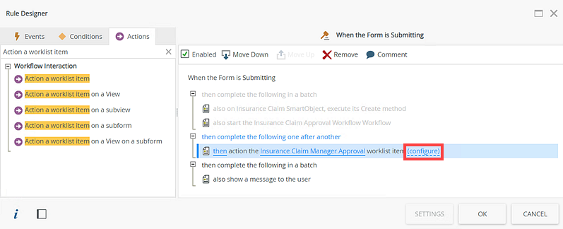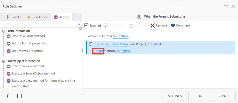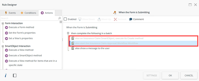 - Disable the also on the Insurance Claim SmartObject, execute its Create method and also start the Insurance Claim Approval Workflow Workflow actions.