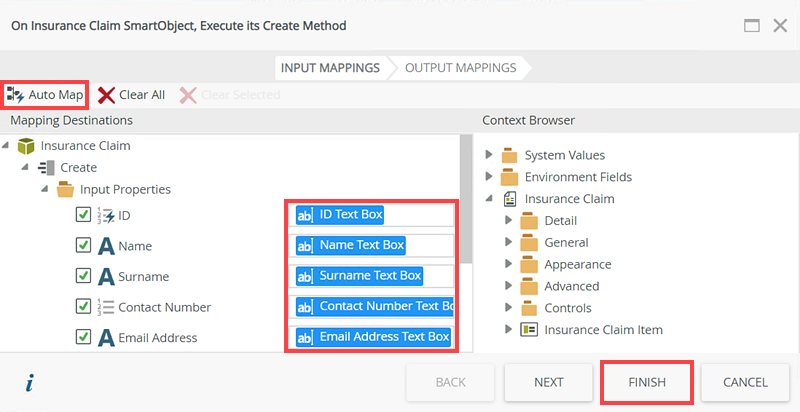 - Click configure. On the On Insurance Claim SmartObject, Execute its Create Method page, click Auto Map. There are no output mappings. Click Finish.