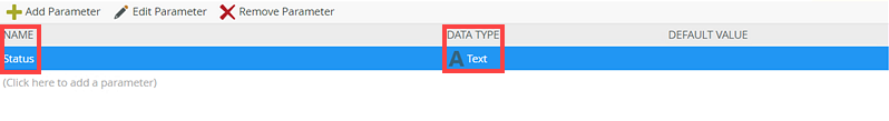 - Name the parameter Status, set the data type to Text, and leave the default value as blank. Click Finish.
