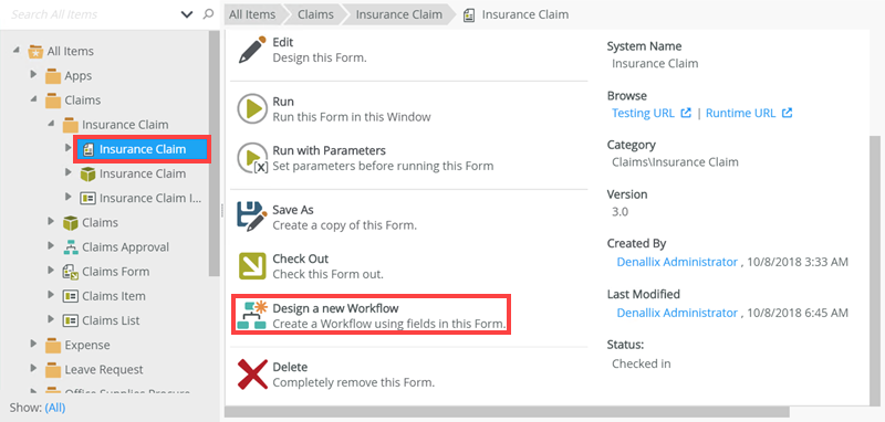 - Select the Insurance Claim form and click Design a new Workflow.
