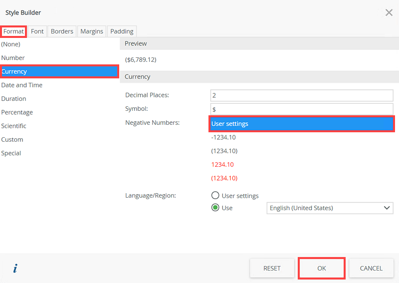 - On the Style Builder page, select Currency in the Format tab, then User Settings. Click OK.