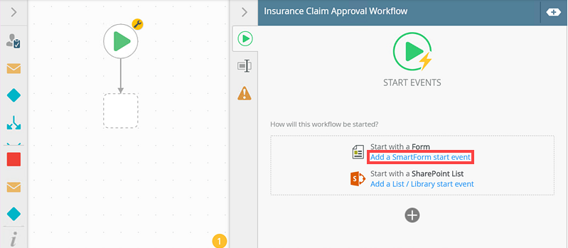 - Select the Start event and click Add a SmartForm start event.