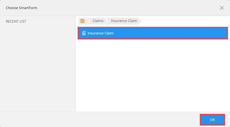 - Select the Insurance Claim form on the Choose SmartForm page then click OK.