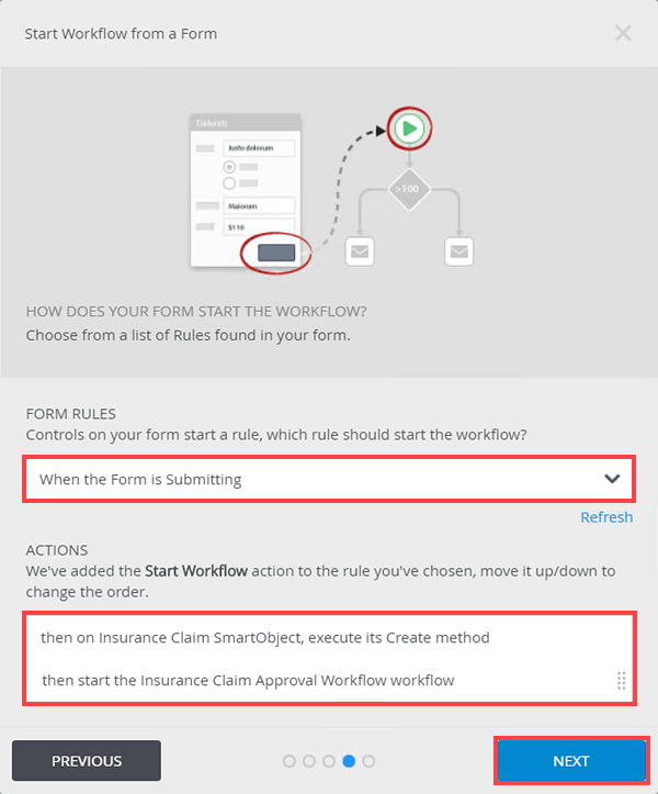 - Click Next on the Start Workflow from a Form page.