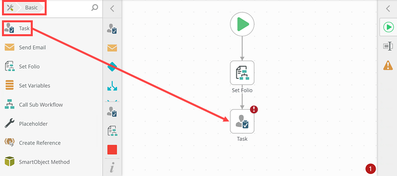 - Drag a Task step from the Basic section of the Toolbox onto the canvas.