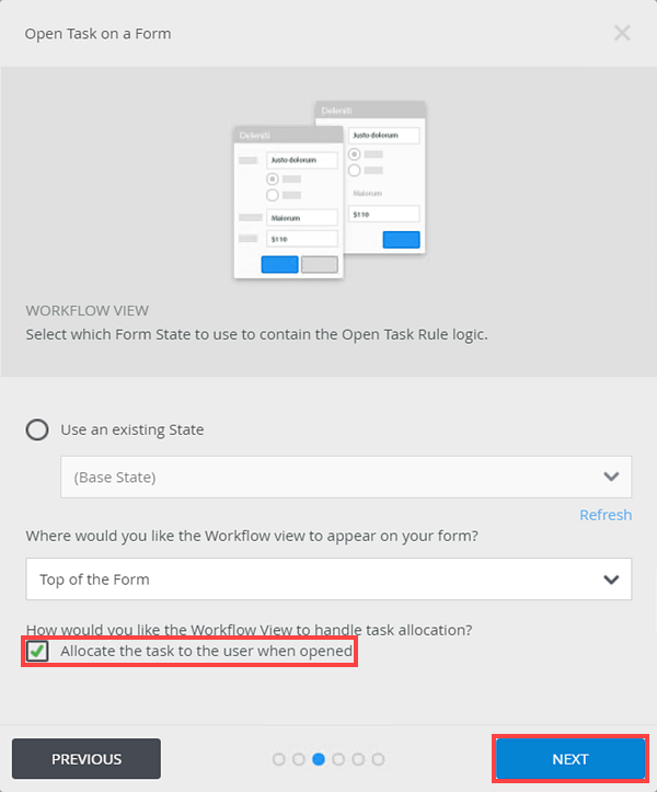 This state is used in the approval part of the workflow after the claim is submitted by Codi, and Bob must approve or decline the insurance claim in the Workspace (Mobile) app. - On the same page, select the Allocate the task to the user when opened option and click Next.