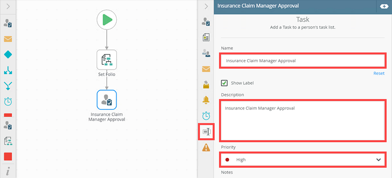 - On the Task page, click the Properties tab and rename the task name to Insurance Claim Manager Approval. Add the following to the Description: Insurance Claim Manager Approval. Set the task Priority to High.