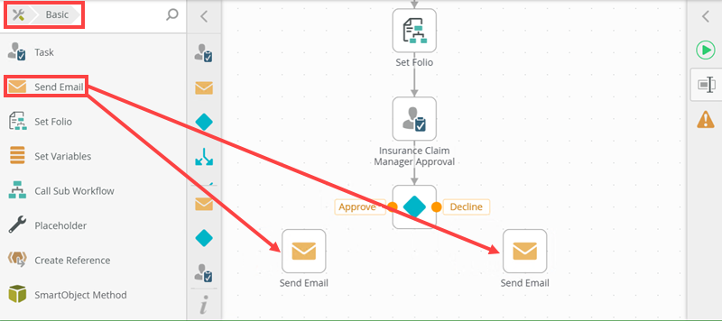 - Drag two Send Email steps from the Basic section of the Toolbox onto the canvas.