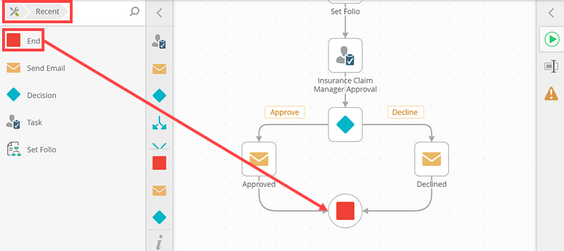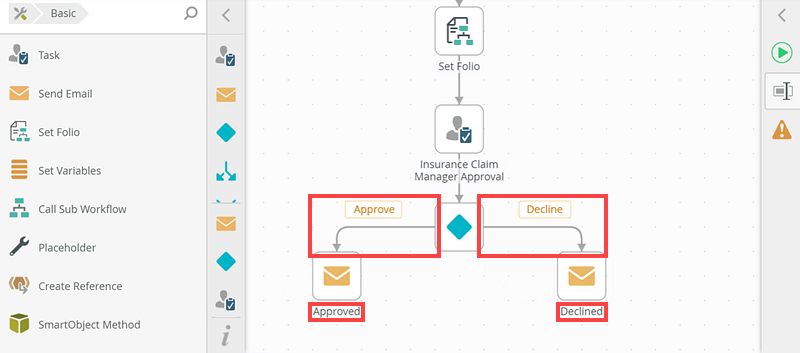 - Connect the Insurance Claim Manager Approval step to the Decision step. Notice that the actions are generated on the canvas.