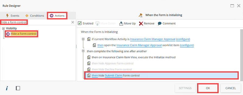 - Add a Hide a Form control action to the rule and select the Submit Claim option. Click OK. Bob does not need to see the Submit Claim button to approve or decline the claim.