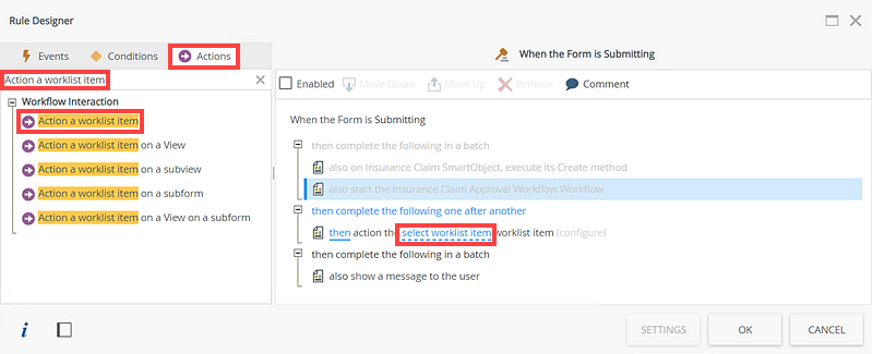 - Add a Action a worklist item action to the rule. Click select worklist item.
