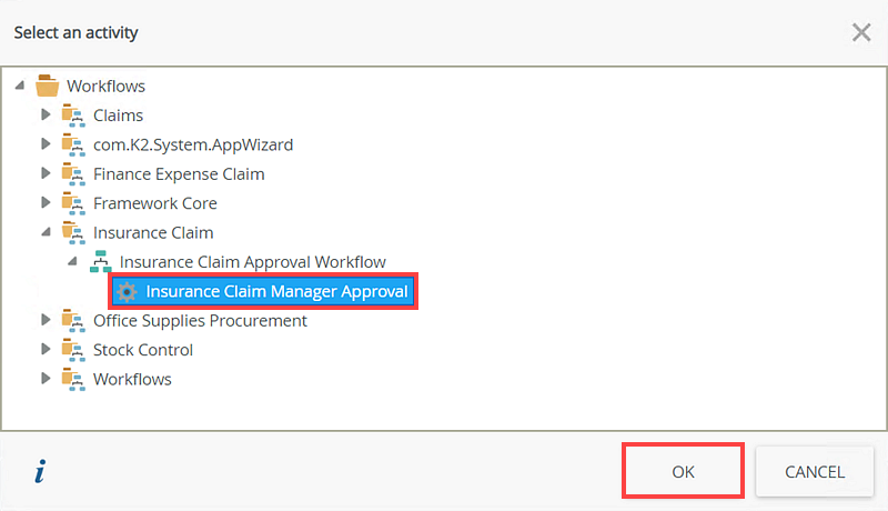 - On the Select an activity page, select the Insurance Claim Manager Approval activity and click OK.