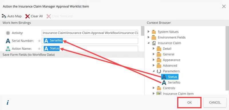 - On the Action the Insurance Claim Manager Approval Worklist Item page, drag the Status and SerialNo parameters to the corresponding Work Item Bindings. Click OK.