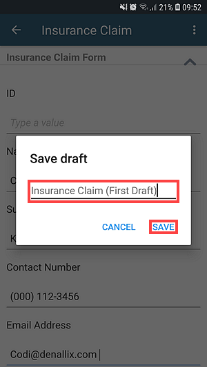 - The draft of the Insurance Claim form is saved in the Drafts section of the Workspace (Mobile) app.